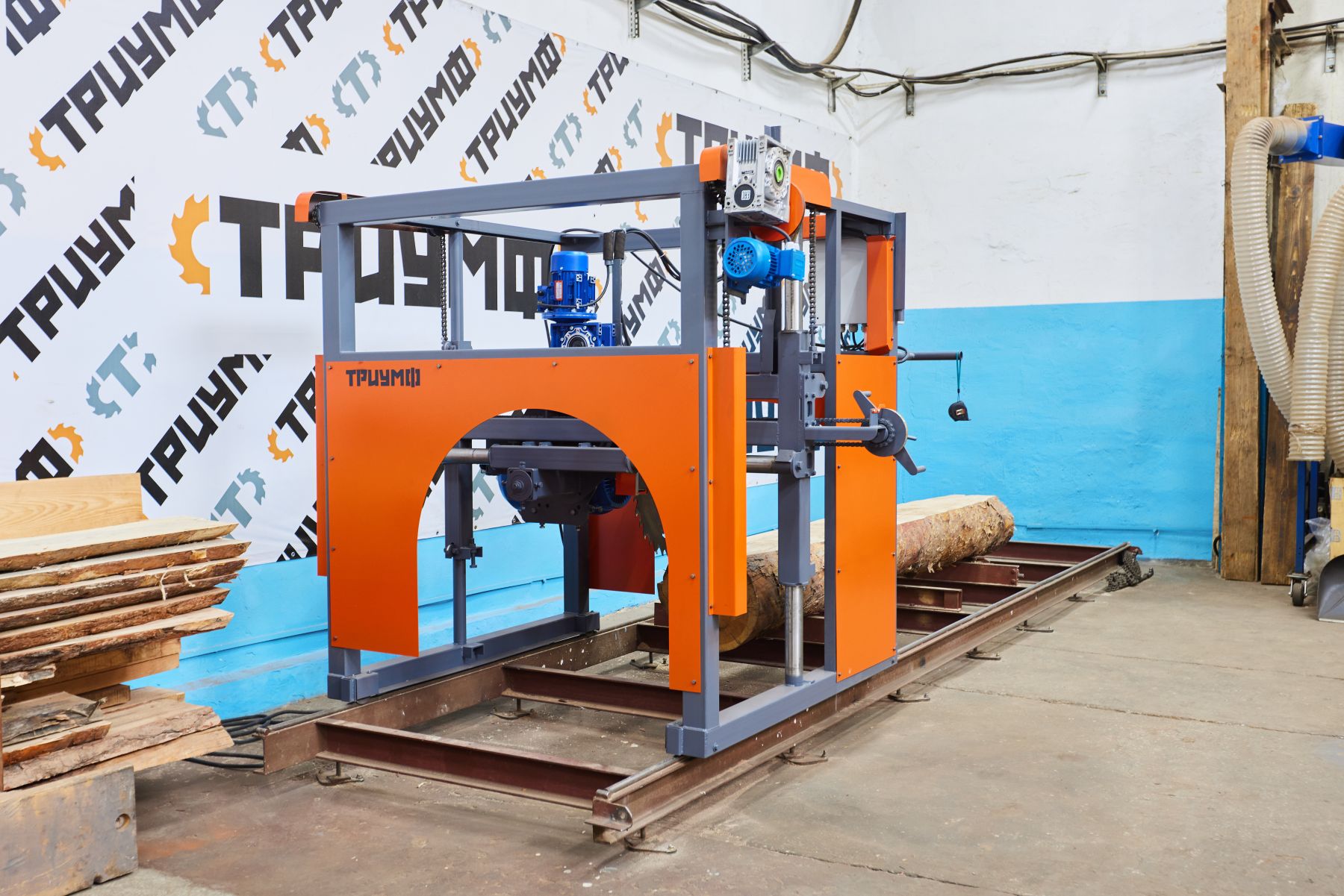 Пилорама дисковая угло-поворотная «ТРИУМФ» 1П предназначена для продольной распиловки бревен с целью получения пиломатериала в виде брусьев, обрезных досок, брусков, шпона.